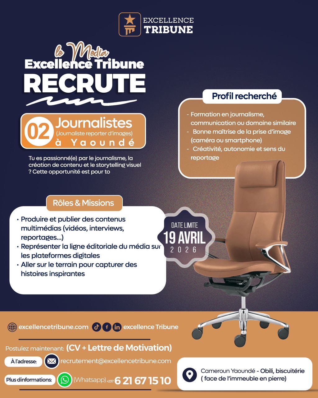 Publié le 04-04-2026 11:17:37Le média Excellence Tribune recrute ! 🎥 02 Journalistes (reporters dLire Plus